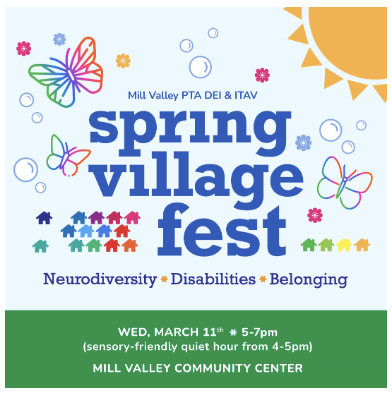 I would also like to highlight the Spring Village Fest, sponsored by our PTA DEI Committee, on March 11 from 4:00–7:00 p.m. at the Mill Valley Community Center. In recognition of Developmental Disabilities Awareness Month, this gathering is designed to provide families with a welcoming space to learn more about neurodiversity and disabilities while connecting with community organizations and local resources.